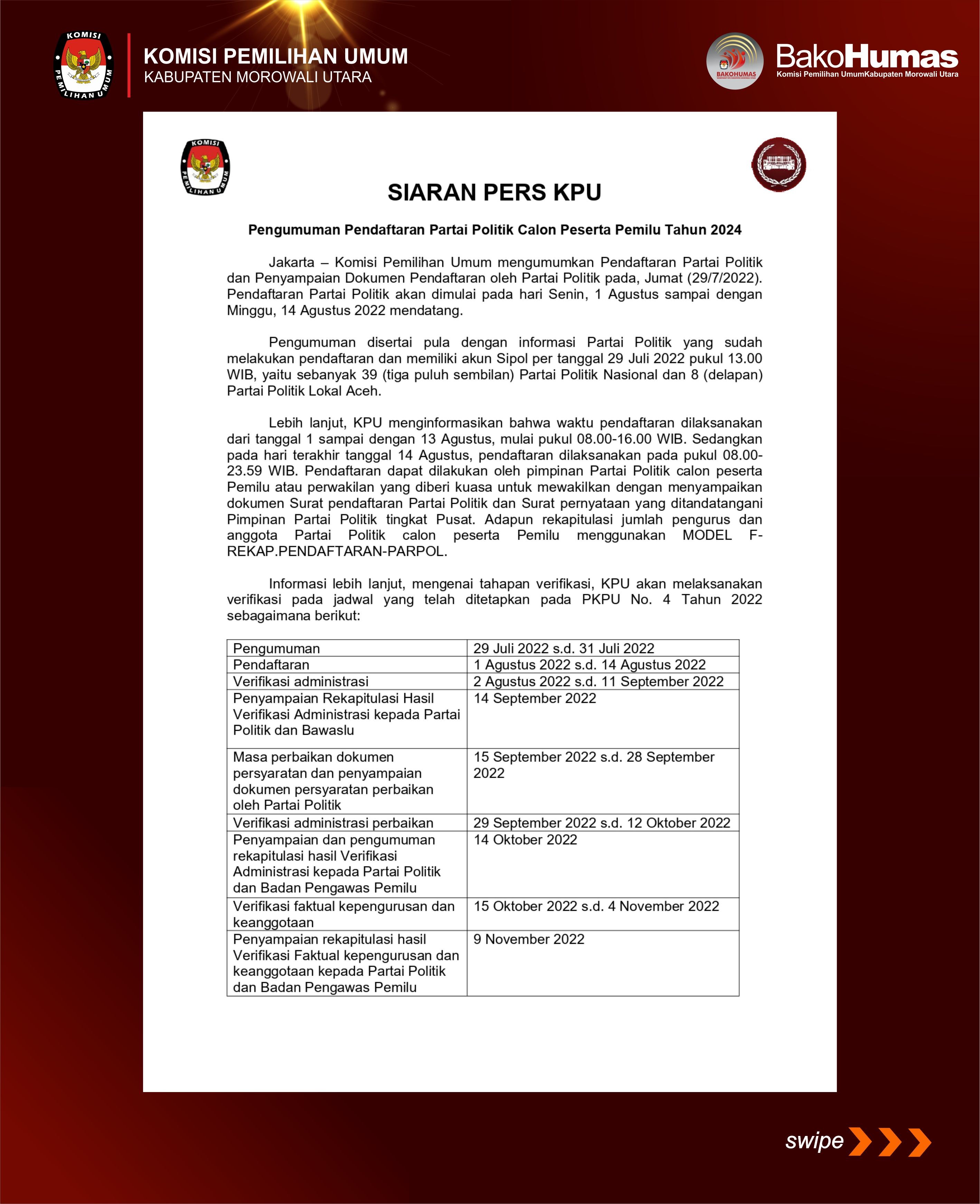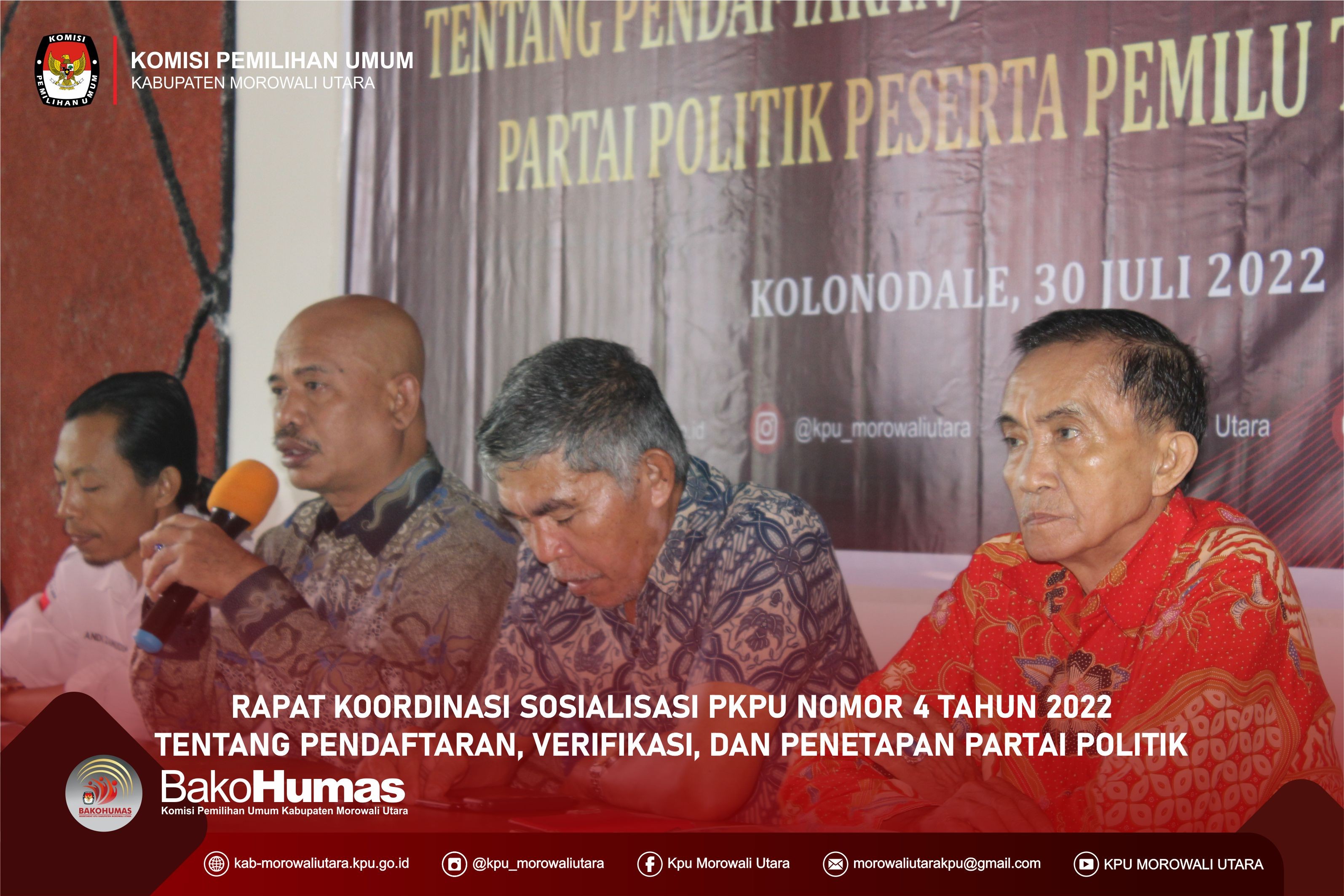 Bertempat di ruang pertemuan DIGIS New, jalan poros Ganda-ganda Kolonodale, KPU Kabupaten Morowali Utara laksanakan Rapat kordinasi sosialisasi PKPU 4 Tahun 2022 tentang Pendaftaran dan verfikasi partai peserta Pemilu Tahun 2024, dengan menghadirkan pembawa materi Ketua Divisi Teknis KPU Provinsi Sulawesi Tengah Samsul Gafur, SH. Kegiatan dibuka oleh Ketua KPU Kabupaten Morowali Utara tepat pukul 09.30 Wita . hadir pada kegiatan tersebut Komisioner KPU Kabupaten Morowali Utara, Ketua Bawaslu Kabupaten Morowali Utara dan Anggota, Kepala Kesbagpol, Kadis Dukcapil dan sejumlah Ketua partai politik calon peserta antara lain Partai Golkar, PKB, Hanura, Demokrat, Perindo, PKS, Nasdem, PDIP, PBB, Partai Buruh, PPP, PAN, Gerindra dan Partai Perkasa. Dalam sambutannya Ketua KPU Morowali Utara Yusri Ibrahim, mengajak kepada semua peserta Rakor untuk bersinergi dalam proses tahapan pendaftaran dan verifikasi partai peserta Pemilu agar dapat berjalan dengan baik. Kegiatan berkahir pukul 12.00 dilanjutkan dengan makan siang.....