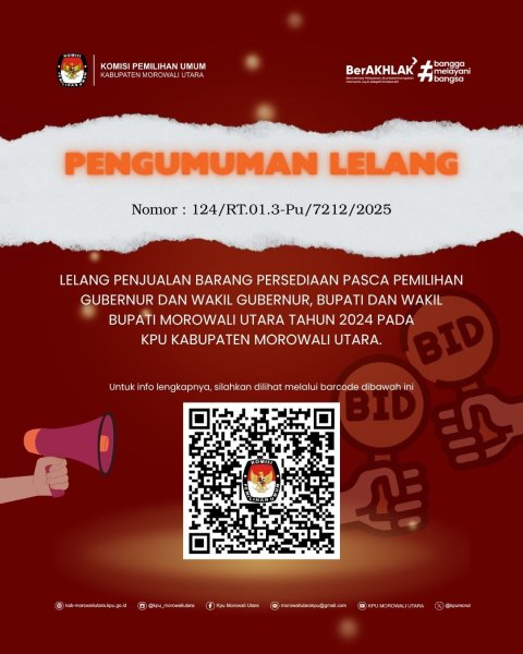Morowali Utara - Komisi Pemilihan Umum (KPU) Kabupaten Morowali Utara secara resmi mengumumkan pelaksanaan Lelang Penjualan Barang Persediaan Pasca Pemilihan Gubernur dan Wakil Gubernur, Bupati dan Wakil Bupati Morowali Utara Tahun 2024. Pengumuman lelang resmi ini diterbitkan dengan Nomor : 124/RT.01.3-Pu/7212/2025. Lelang ini mencakup barang-barang persediaan yang tidak terpakai atau sisa dari pelaksanaan tahapan Pemilu dan Pilkada tahun 2024 di wilayah Kabupaten Morowali Utara. Bagi masyarakat atau pihak yang tertarik untuk berpartisipasi dan mengetahui rincian lengkap mengenai barang yang dilelang, jadwal dan prosedur penawaran, informasi lengkap dapat diakses dengan memindai kode batang (barcode) yang tertera pada pengumuman resmi. KPU Kabupaten Morowali Utara memastikan proses lelang akan berjalan secara transparan dan terbuka. Informasi lebih lanjut juga dapat diakses melalui kanal resmi KPU Kabupaten Morowali Utara, termasuk laman web kab-morowaliutara.kpu.go.id dan media sosial resmi lainnya. ....