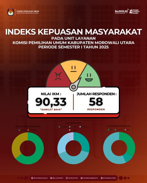 Survei ini melibatkan 58 responden dan mencerminkan keberhasilan KPU dalam memberikan layanan yang memuaskan selama periode semester I tahun 2025. Data ini menjadi bukti komitmen KPU Morowali Utara untuk terus meningkatkan kualitas pelayanan publiknya.