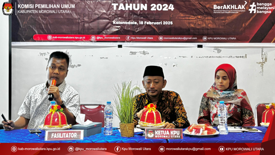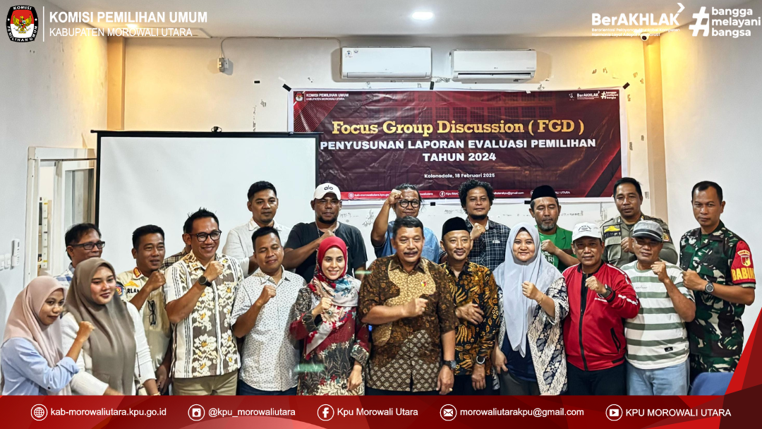 Kolonodale, kab-morowaliutara.kpu.go.id - Komisi Pemilihan Umum Kabupaten Morowali Utara melaksanakan Focus Group Discussion (FGD) dengan agenda Penyusunan Laporan Evaluasi Pemilihan Tahun 2024 pada Tanggal 18 Februari 2025 bertempat di Ruang pertemuan Aroma Laut, yang dihadiri oleh Instansi terkait, anggota Parpol, serta Ormas.