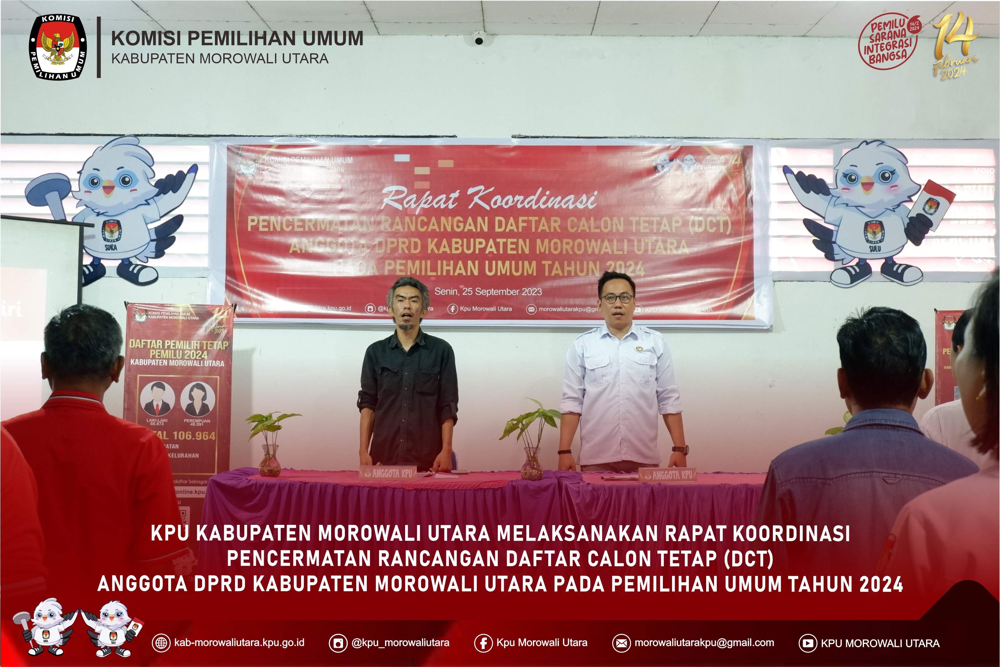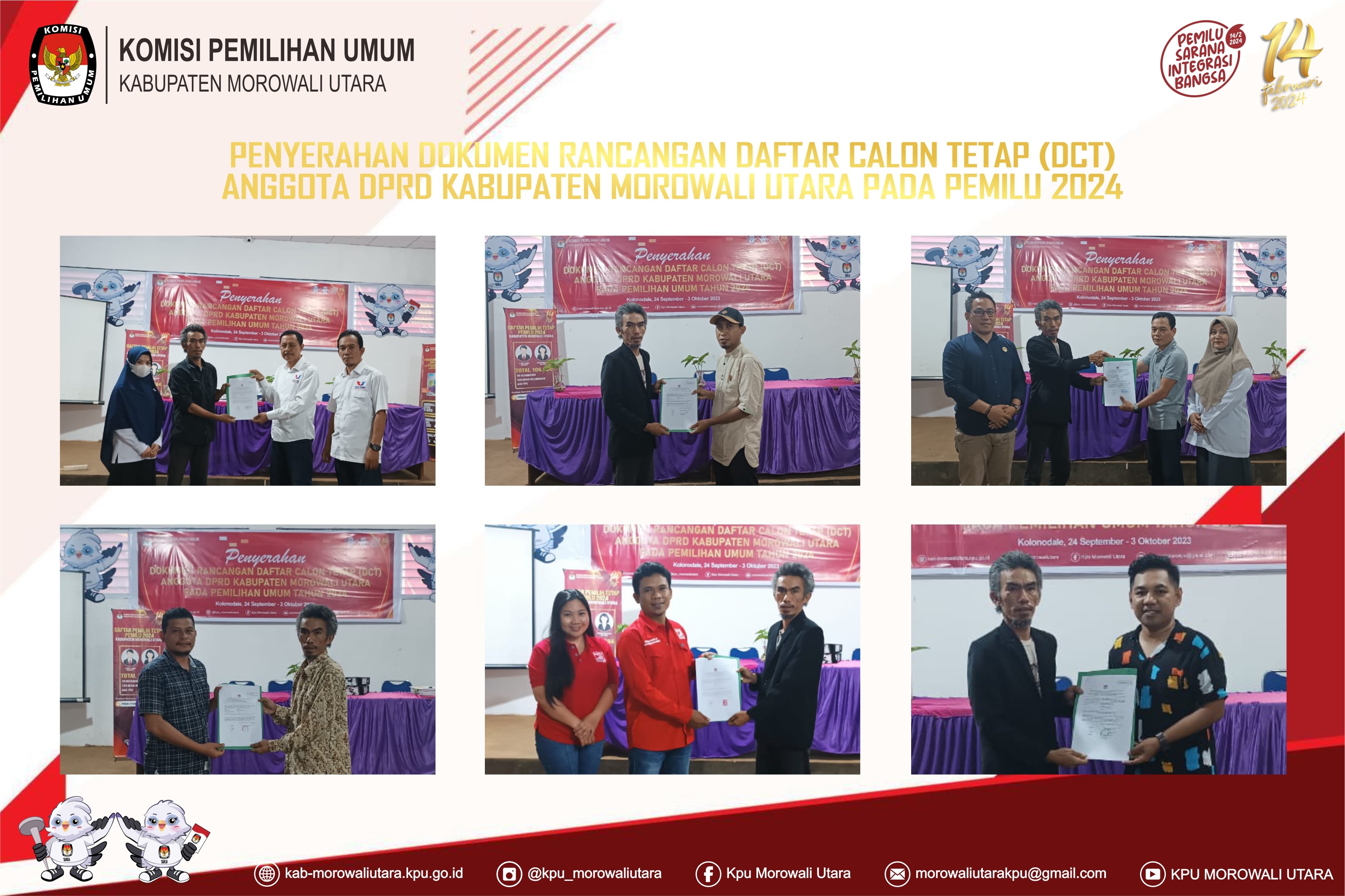 Kolonodale, kab-morowaliutara.kpu.go.id - Pemilihan Umum (KPU) Kabupaten Morowali Utara menerima penyerahan Dokumen Rancangan Daftar Calon Tetap (DCT) Anggota DPRD Kabupaten Morowali Utara dari Partai Politik setelah melalui proses pencermatan, yang bertempat di Kantor KPU Kabupaten Morowali Utara. Selasa, 03/10/2023.
