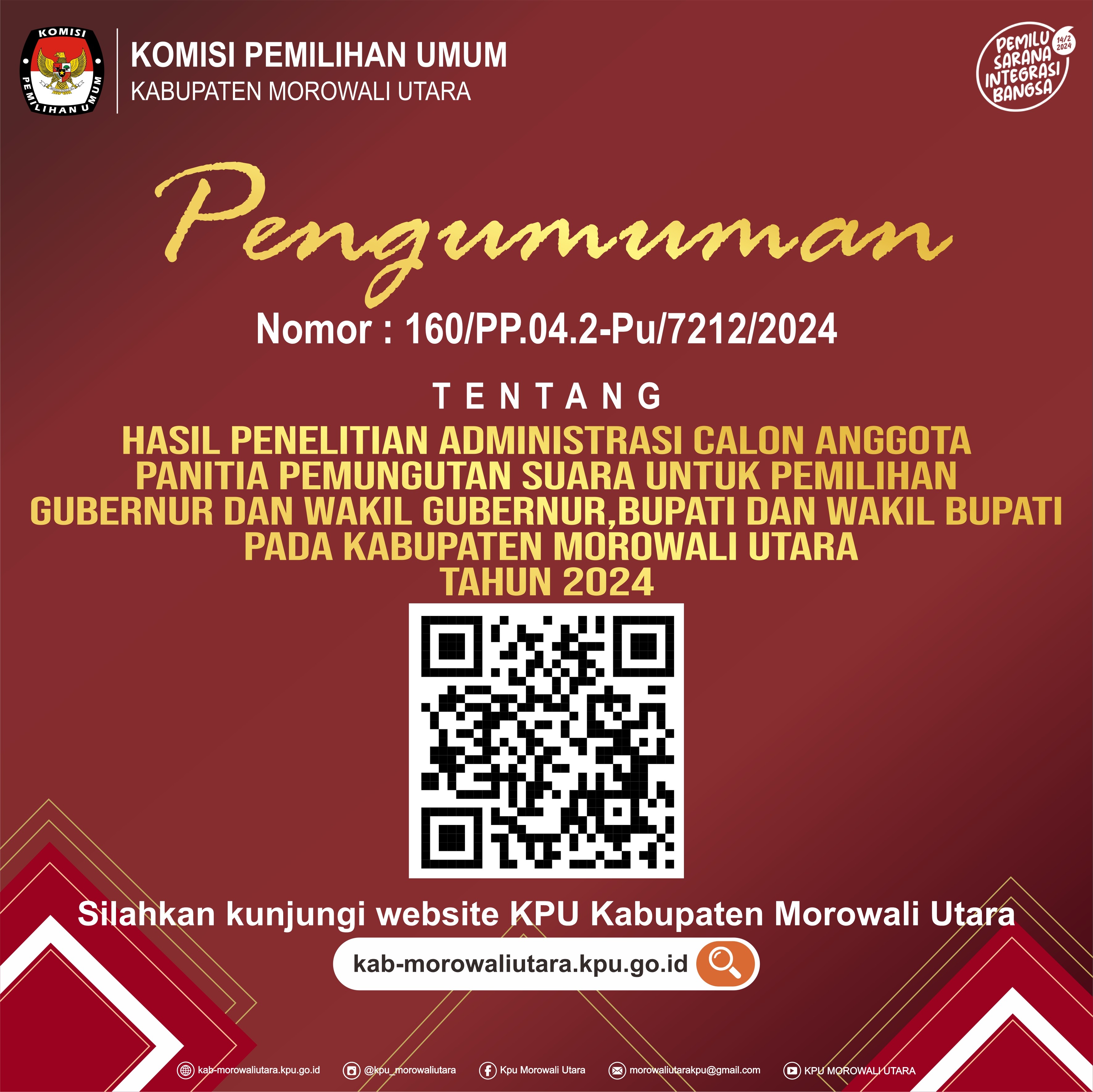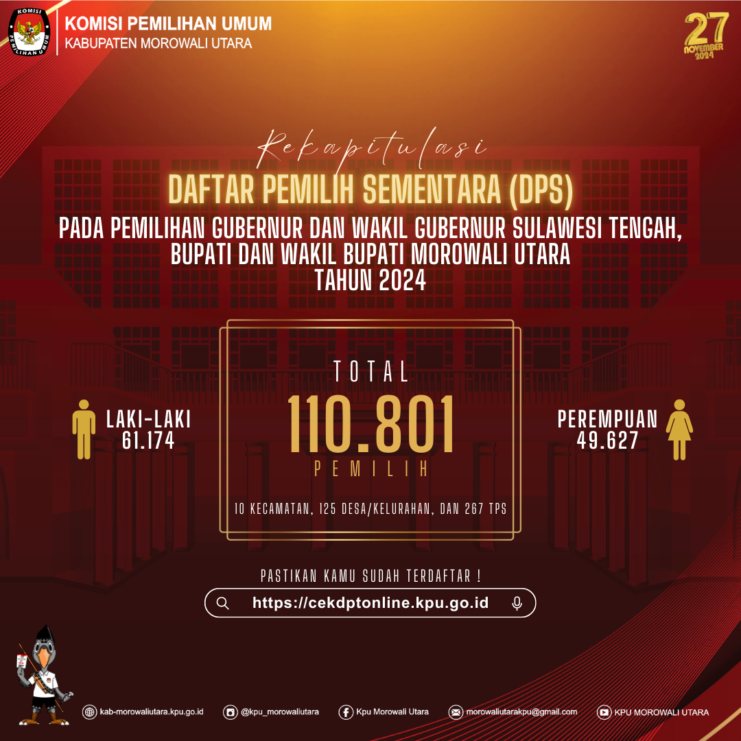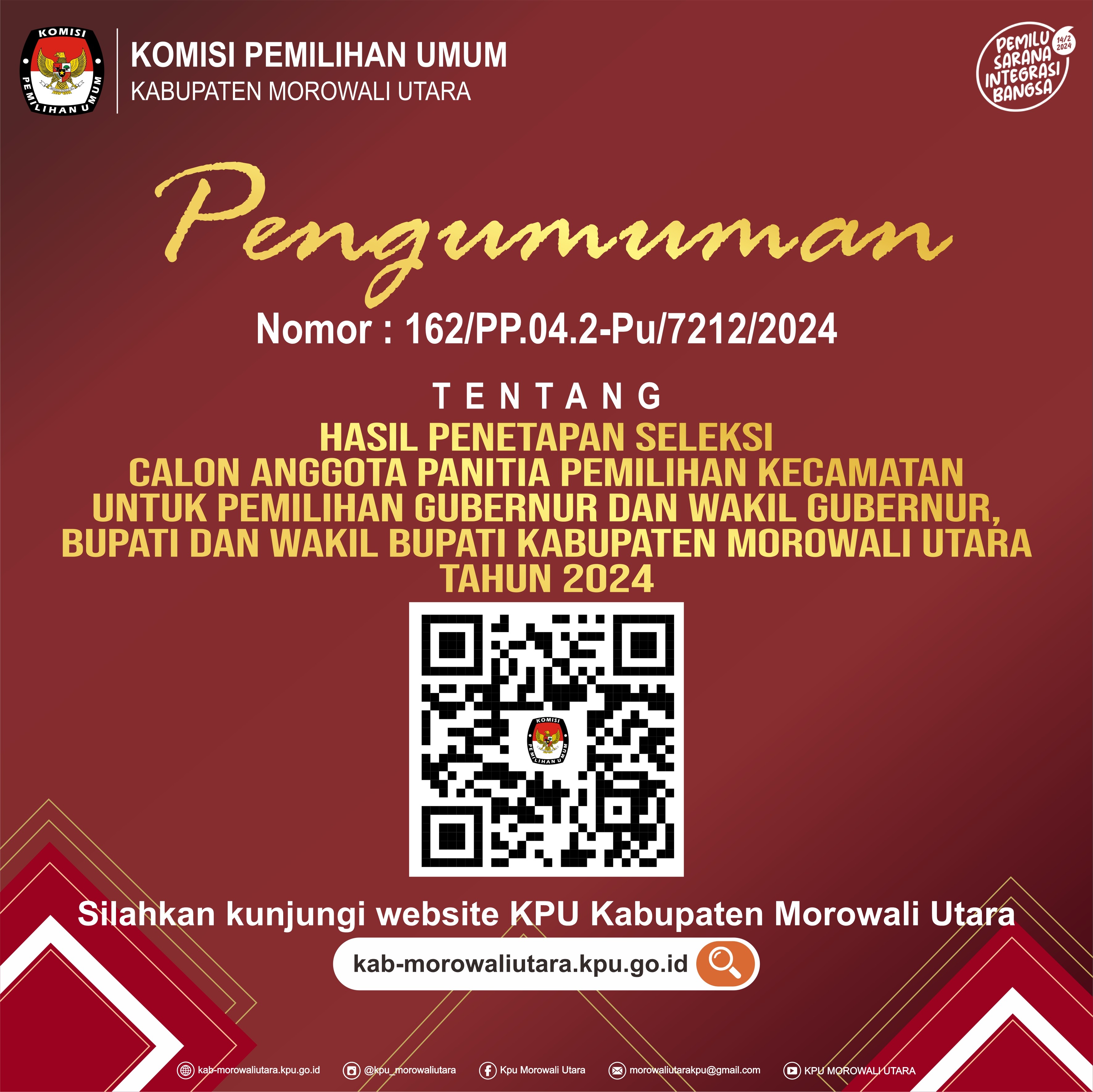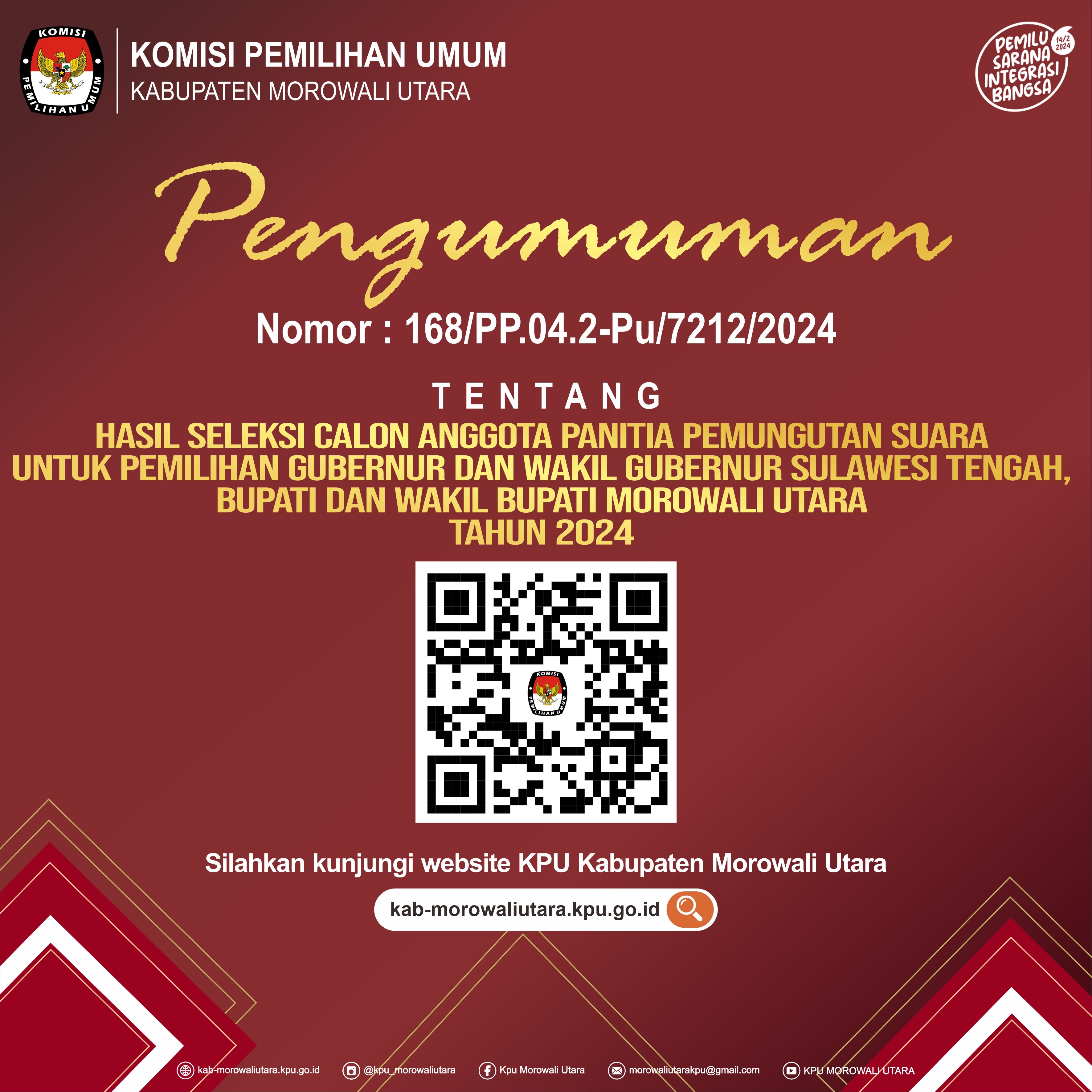 Berikut Pengumuman Komisi Pemilihan Umum Kabupaten Morowali Utara Nomor : 168/PP.04.2-Pu/7212/2024 Tanggal 25 Mei 2024 Tentang Penetapan Hasil Seleksi calon Anggota Panitia Pemungutan Suara Untuk Pemilihan Gubernur dan Wakil Gubernur Sulawesi Tengah, Bupati dan Wakil Bupati Kabupaten Morowali Utara tahun 2024