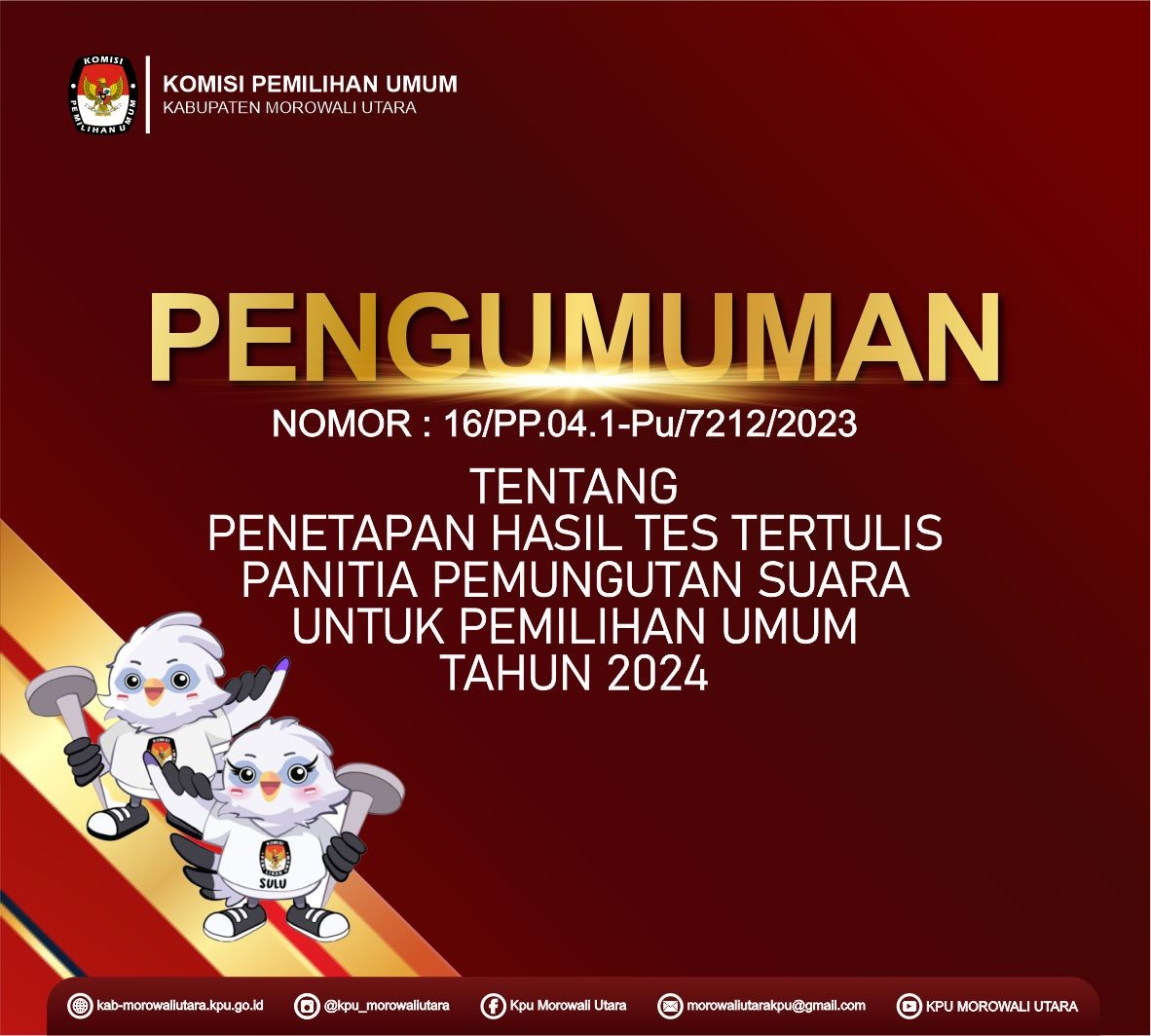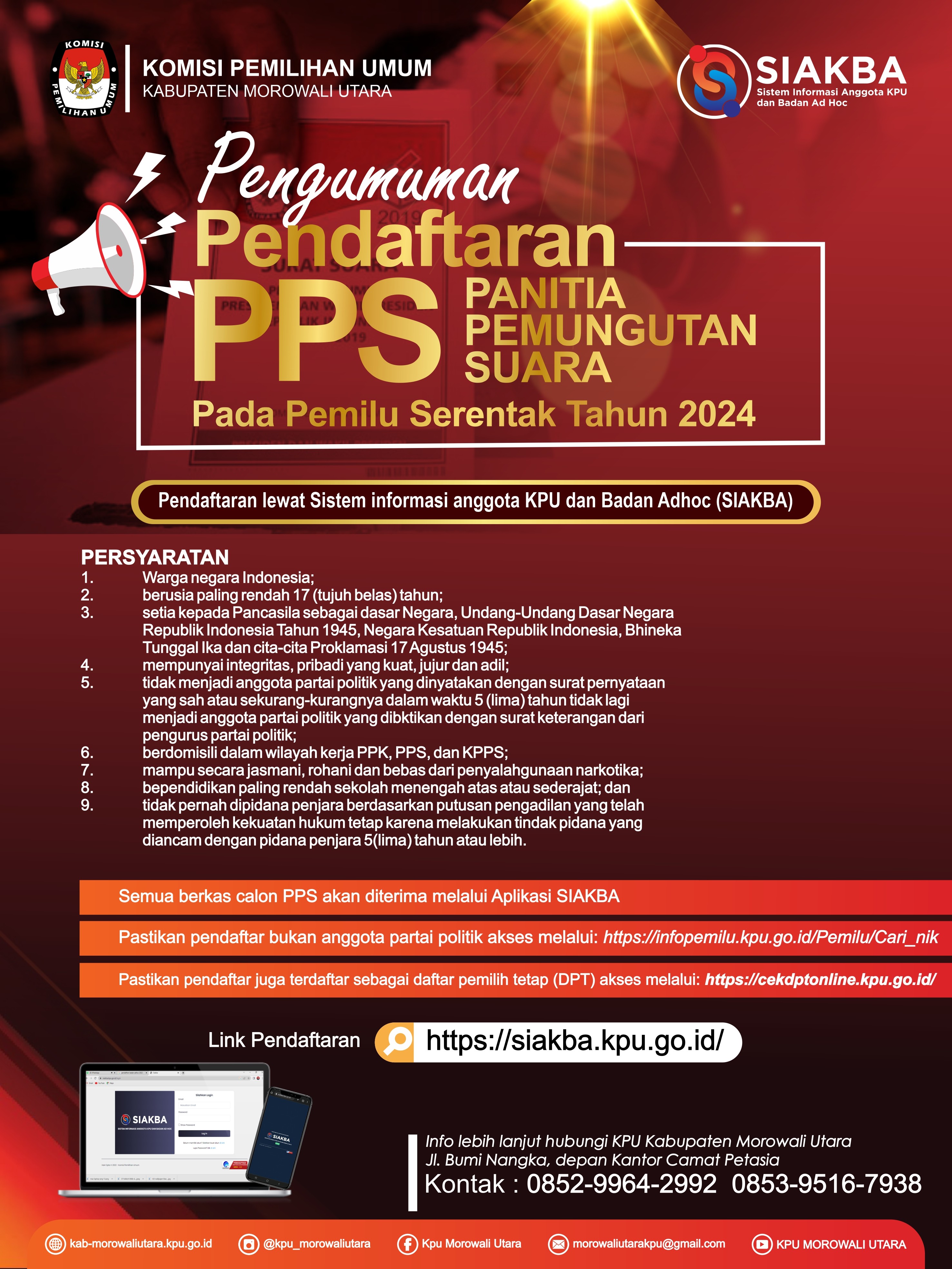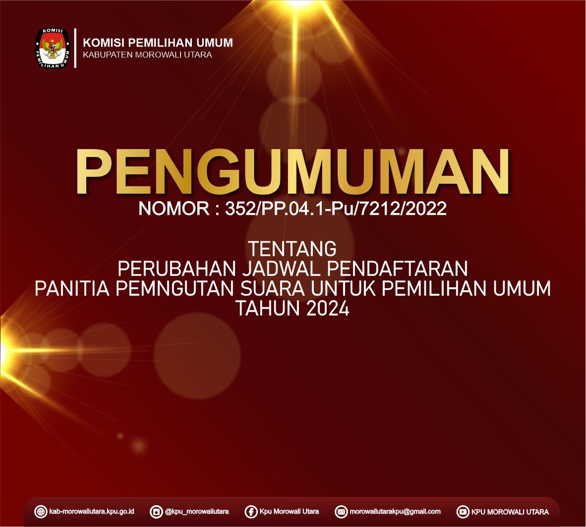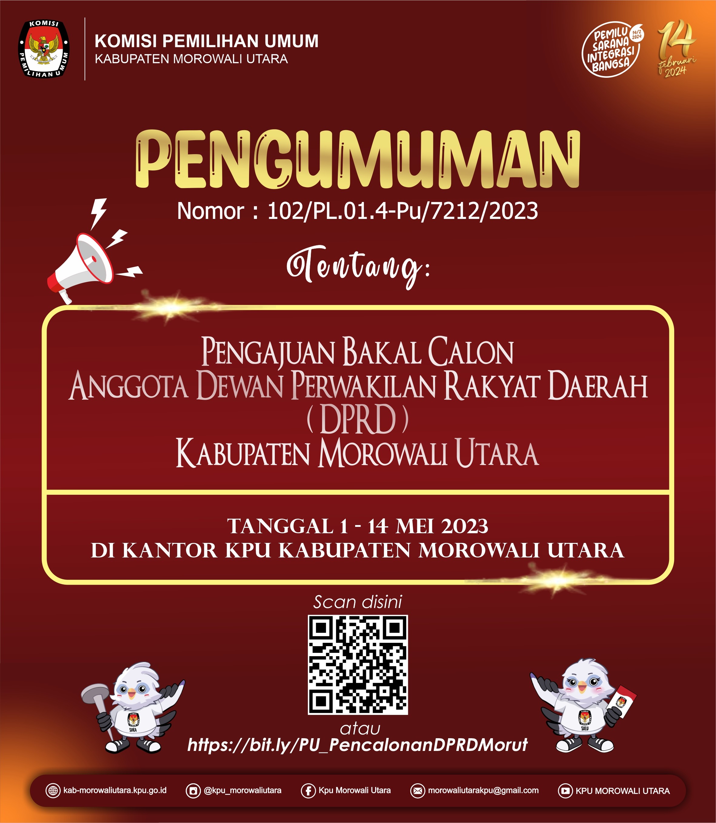 Komisi Pemilihan Umum Kabupaten Morowali Utara membuka penerimaan pengajuan bakal Calon Anggota Dewan Perwakilan Rakyat Daerah (DPRD) Kabupaten Morowali Utara untuk Pemilu Serentak Tahun 2024 melalui Partai Politik Peserta Pemilu pada kepengurusan tingkat Kabupaten/Kota dengan ketentuan sebagai berikut :