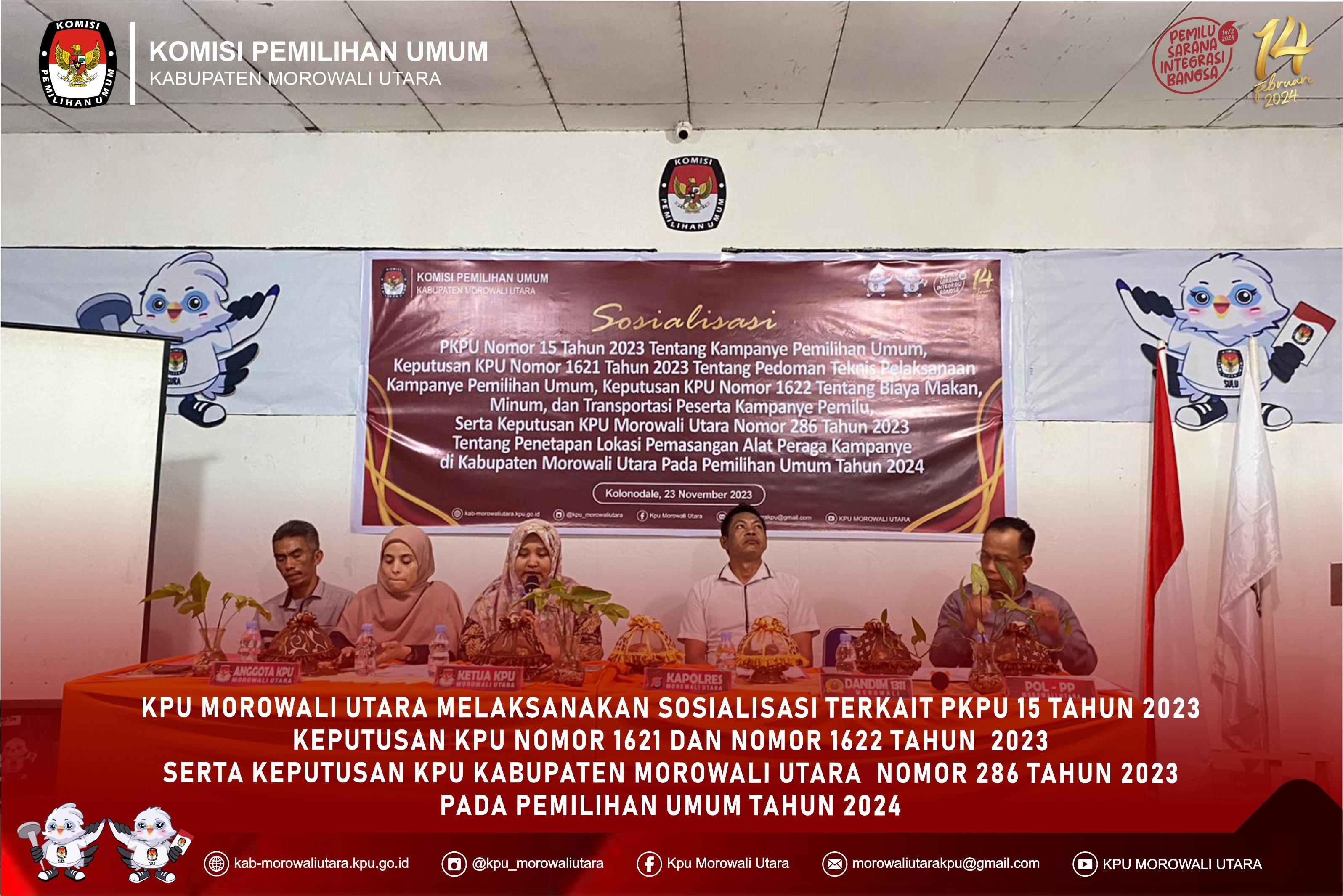 Kolonodale, //kab-morowaliutara.kpu.go.id/ Komisi Pemilihan Umum Kabupaten Morowali Utara melaksanakan sosialisasi PKPU 15 Tahun 2023, serta Keputusan KPU Kabupaten Morowali Utara Nomor 286 Tahun 2023, yang dilaksanakan di kantor KPU Kabupaten Morowali Utara, Jalan Bumi Nangka Nomor 6, Kelurahan Bahoue.(23/11/23).